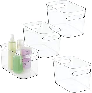 mDesign boite de rangement en plastique (lot de 4) – bac de rangement idéal pour maquillage, parfum, lotions, etc. – panier de rangement avec poignées pour rangement de serviettes – transparent